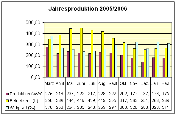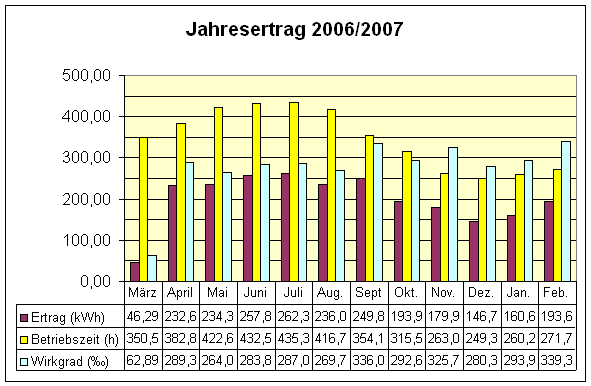 Diese Werte setzen sich aus den Tageswerten (Summe der Tageserträge je Monat) zusammen und umfasst den Zeitraum vom 1.März bis zum 28.Februar des darauf folgenden Jahres. Der Wirkungsgrad in Tausendstel bezieht sich auf die maximale Leistung der Fotovoltaikanlage(2,1 kW). |